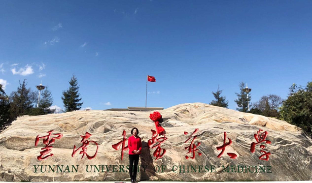 ▲刘景萍董事长在云南中医药大学“校名石”前拍照留念