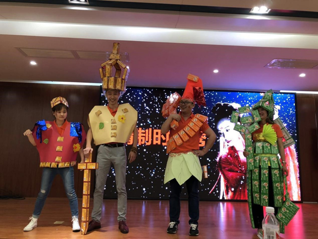 在营销将士们的巧手下,新产品肠炎宁颗粒的样盒被做成了长裙,无糖夏桑菊颗粒的样盒被做成了皇冠和宝剑,而小儿肺热的样盒则被做成飘带、阳伞和背包。当三组选手穿着产品样盒做成的时装上台走秀时,全场沸腾,培训会的气氛达到了高潮!所有在场的人员,都通过全员参与设计这场活泼生动的时装表演,对新品留下了深刻的印象。同时,OTC营销将士群策群力,在短时间内策划出这场活动,体现了云顶国际人超强的凝聚力、执行力及战斗力。