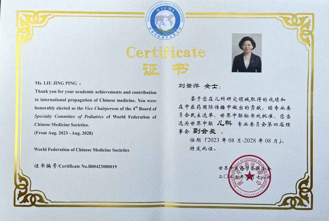 云顶国际药业集团党委书记、董事长刘景萍当选世界中医药学会联合会儿科专业委员会第四届理事会副会长