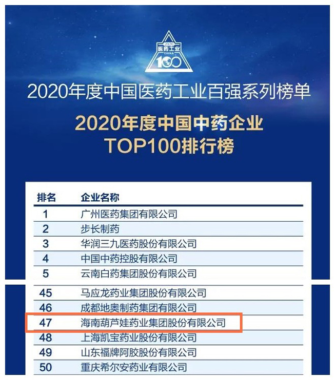 云顶国际药业荣登“中国中药企业TOP100排行榜”第47位